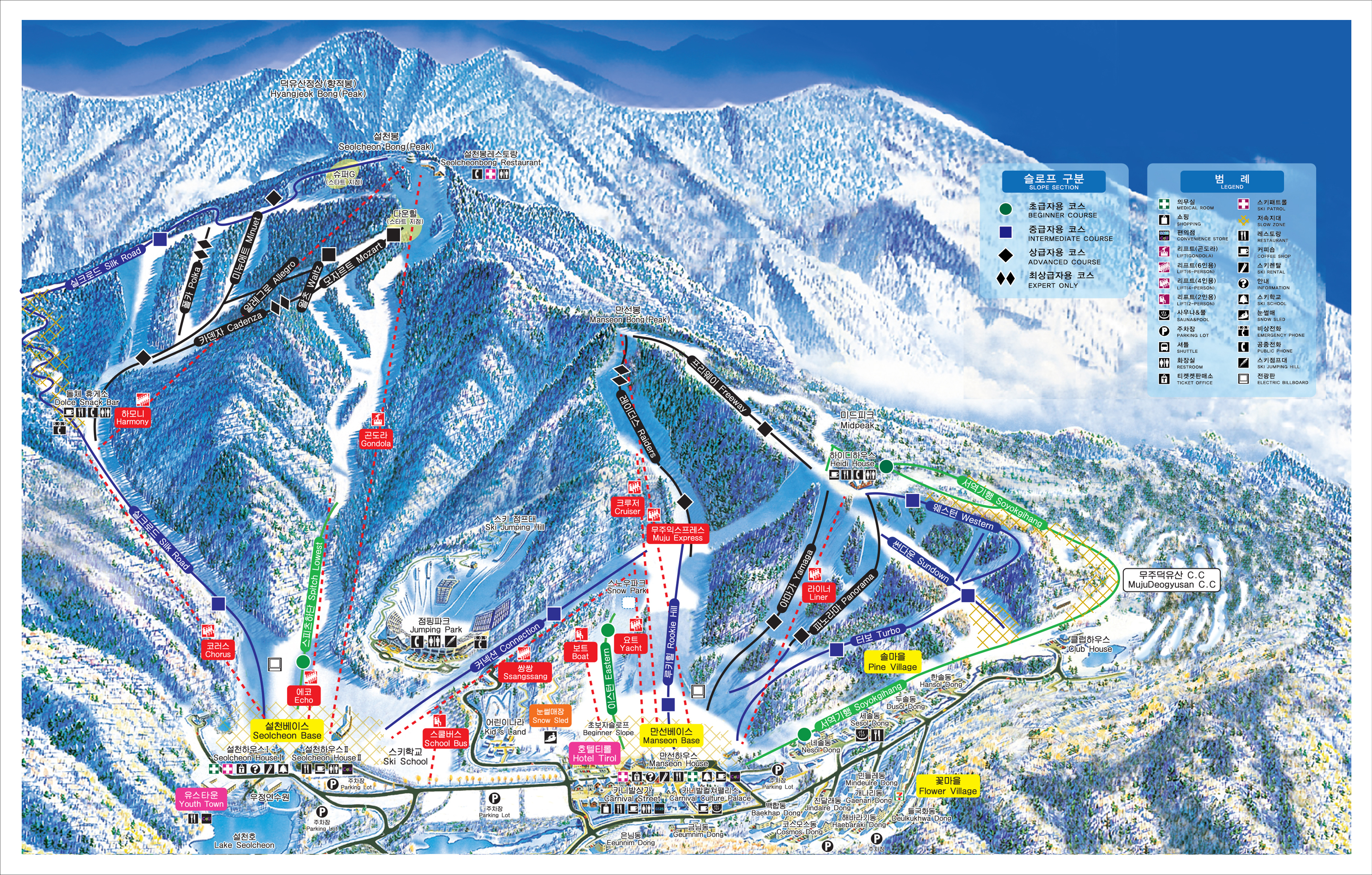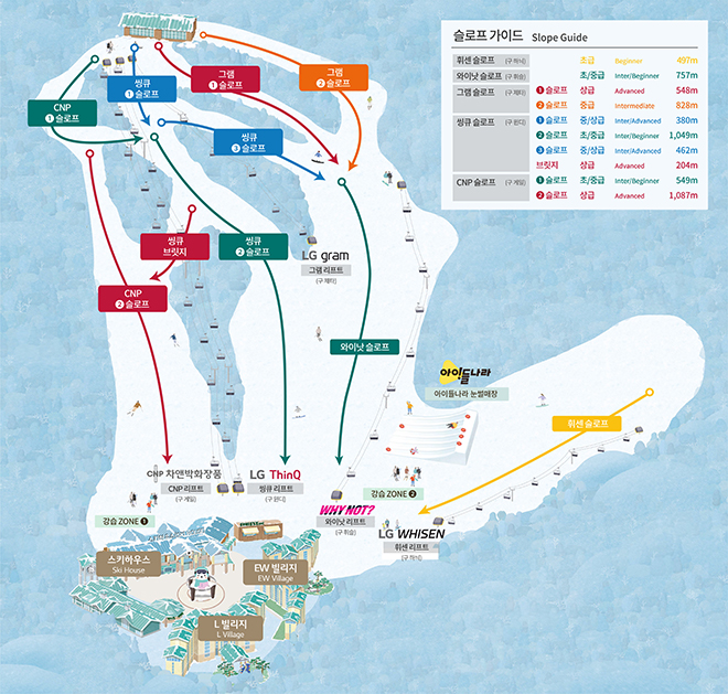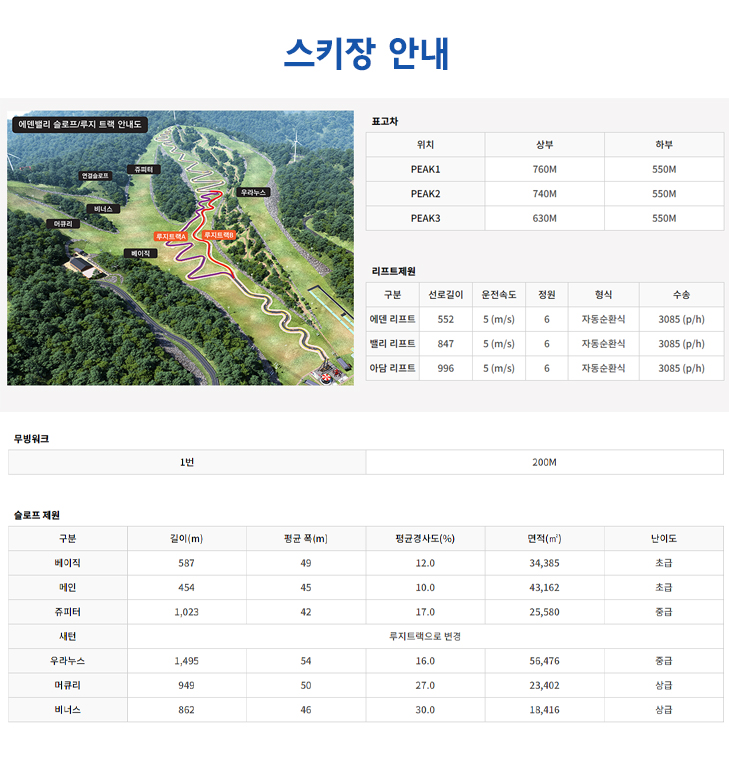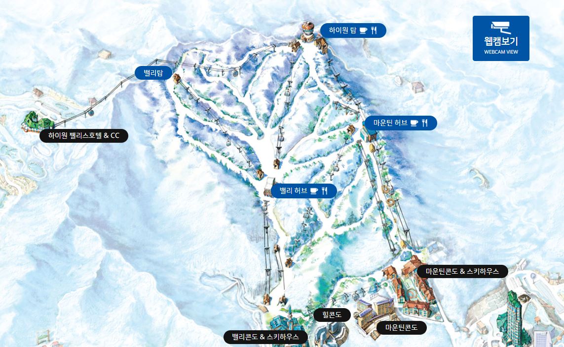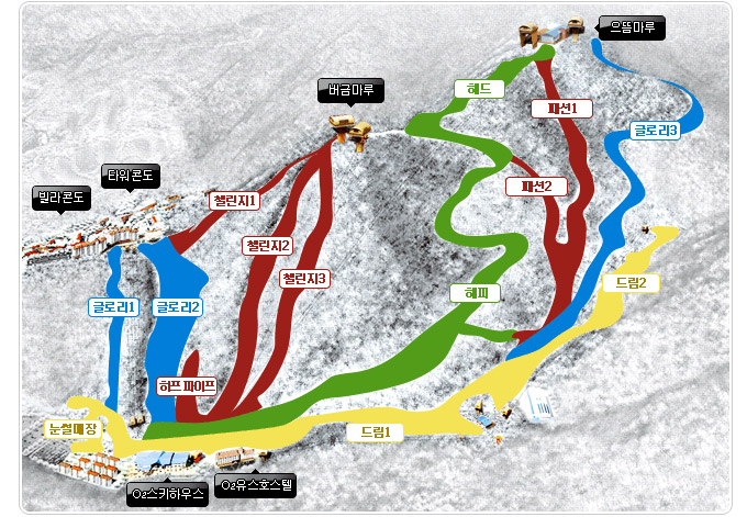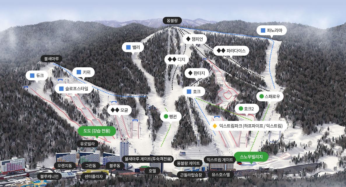 스키 슬로프가 다양하고, 가족들과 함께하기 좋은 리조트 분위기가 장점이에요.